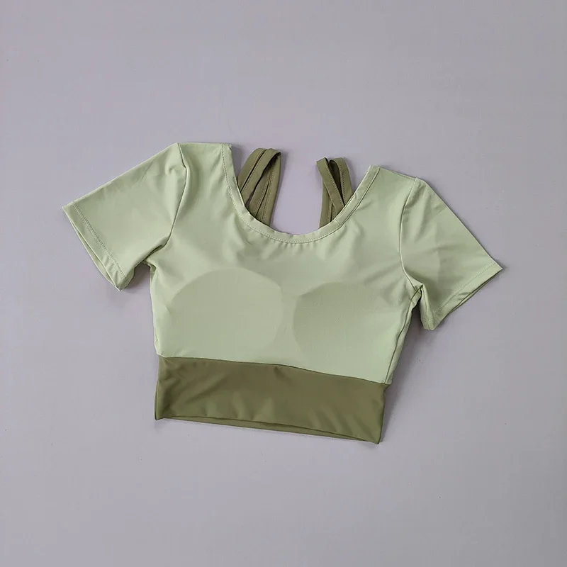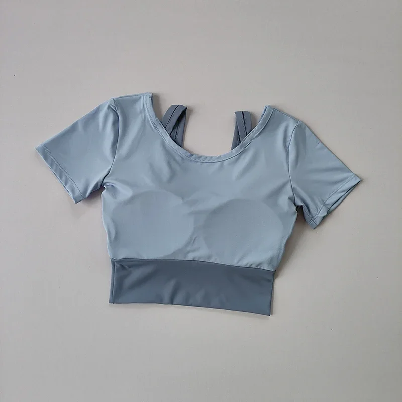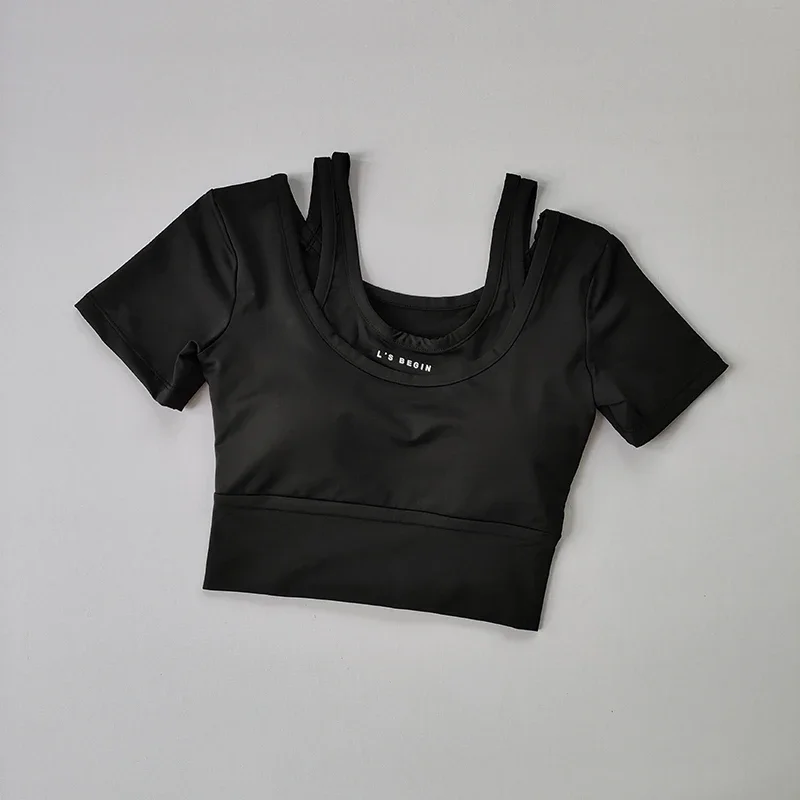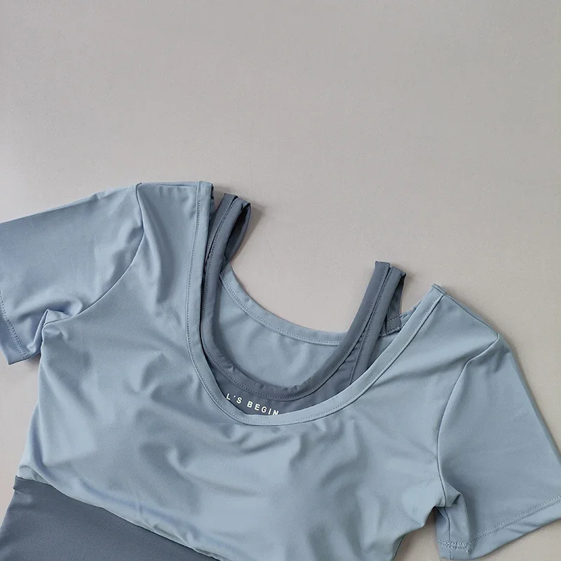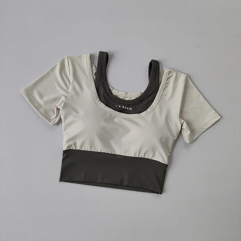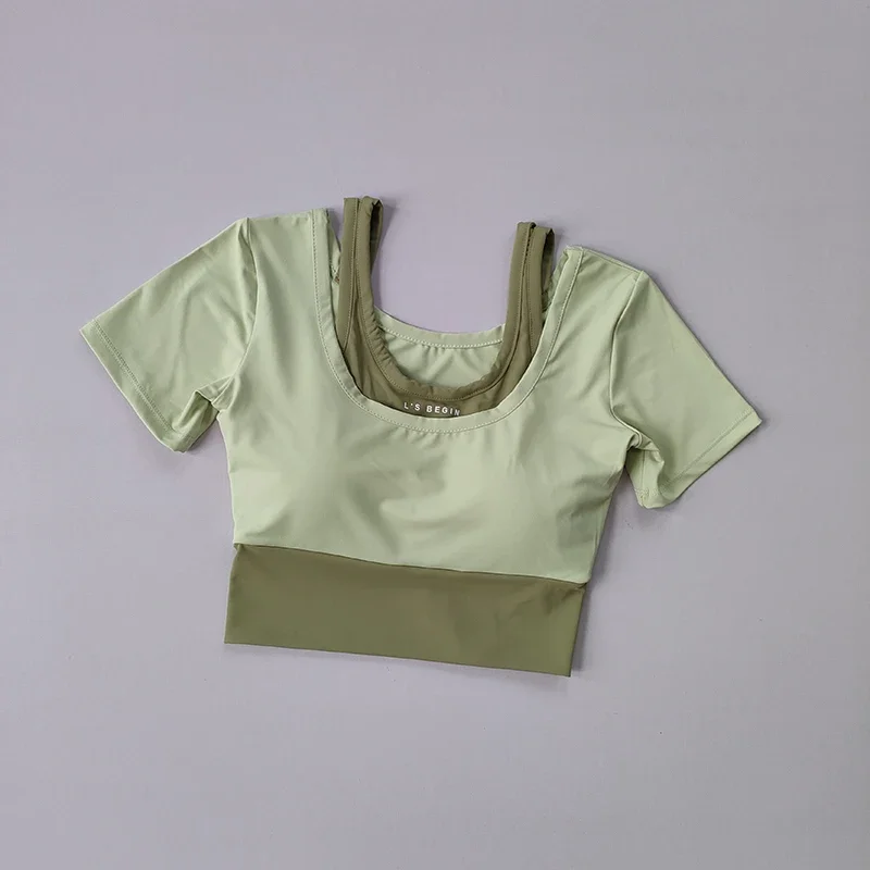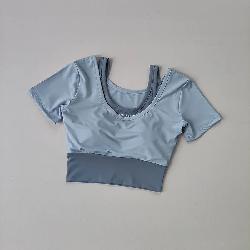 Fake two-piece sports short sleeved women's summer breathable fitness top with bra, fast drying tight short dance yoga clothes